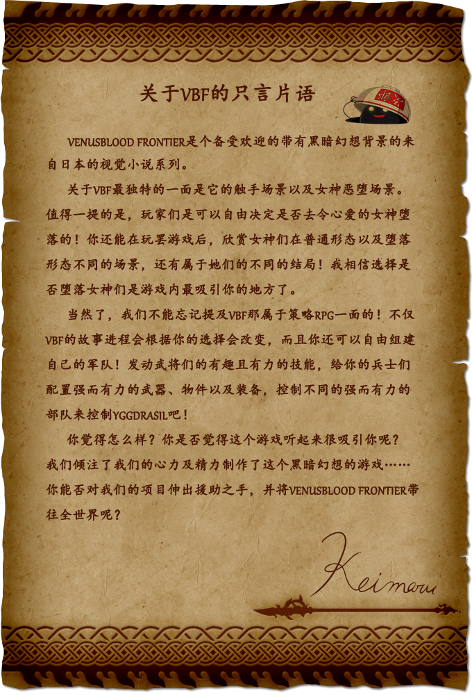 Loki大人希望能掌管整块Yggdrasi大陆,并将属于他的故事——一部名叫《Venusblood Frontier》的游戏传播到世界各地,为了实现他的宏图大略,我们需要一些臣民的帮助,以及一些雇佣兵。